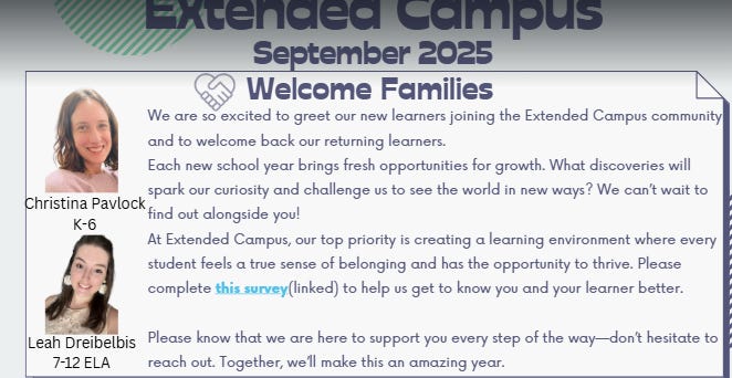 Parents are not left out. Mrs. Leah Driebelbis and Mrs. Christina Pavlov host a weekly Friday Zoom session for parents to ask questions, share strategies, and connect with others supporting learners at home.